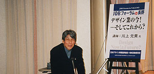 まず講演会では、川上元美氏による「デザイン業の今~そしてこれから」をテーマに講演。自作品のスライドを中心に紹介しながら、時代の変化に対するデザインのあり方、また独自の創造哲学と制作に対する完成まで、多方面の協力者の必要性を強調。その中で川上氏は当組合への参加理由を述べた。