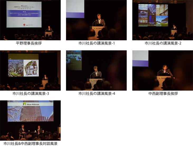 アナウンス期間が短かったにもかかわらず、事前申込がミッドタウンDESIGN HUBの定員100名を越え、急遽市川(株)東京ミッドタウン社長(三井不動産(株)常務執行役員)のご好意によりミッドタウン・カンファレンスルームに変更して総勢131名の参加を見ることができた。